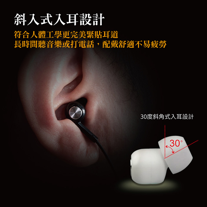 ◆ 斜入式入耳設計,緊貼耳道,不易疲勞