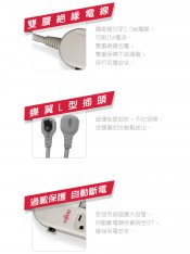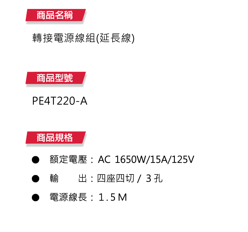 PE4T220-A 3孔四座四切 電源延長轉接線
