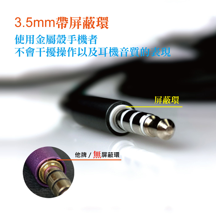 ◆ 3.5mm帶屏蔽環,防金屬殼干擾音質表現