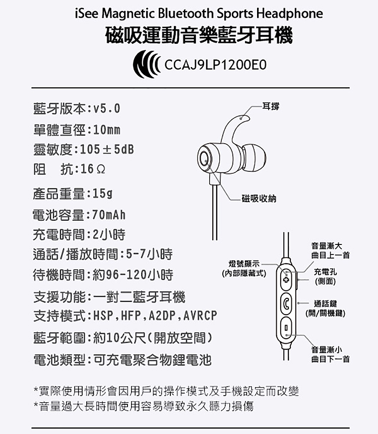 • 省電功能:斷開或沒有連接設備20分鐘,耳機會自動關機