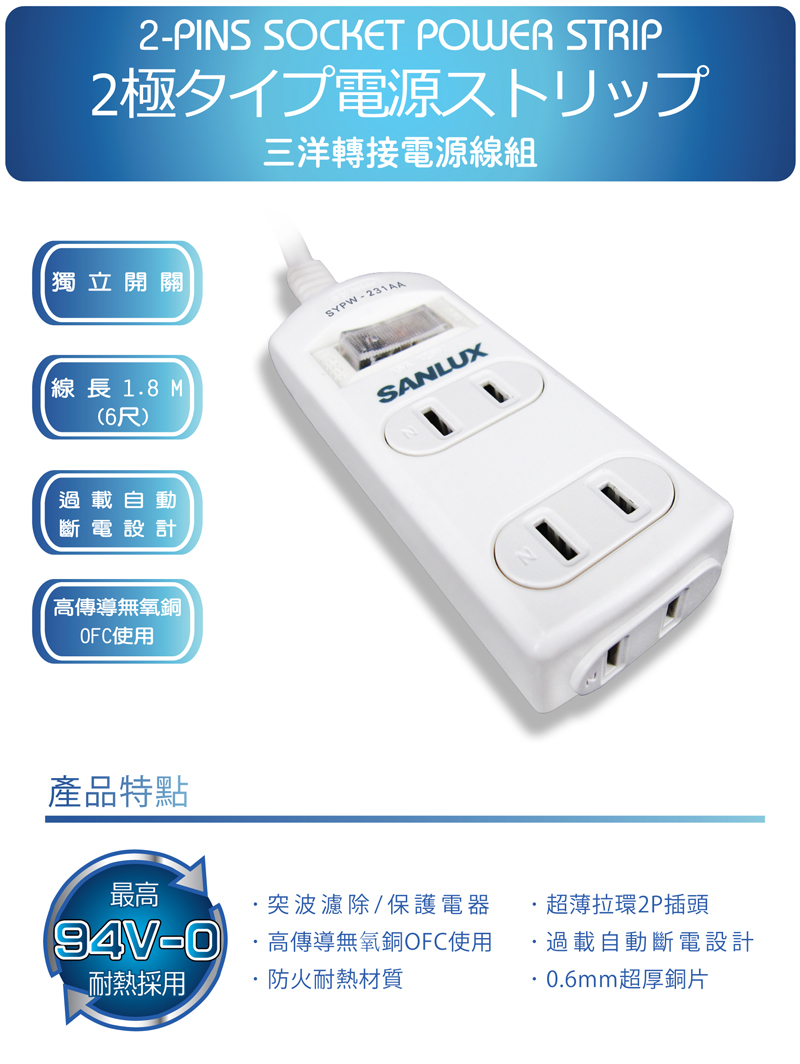 SYPW-231AA 超安全轉接延長電源線-2孔3座單切 - SANLUX台灣三洋