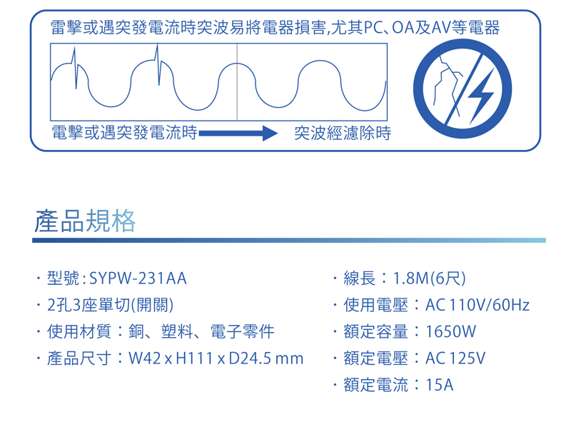 SYPW-231AA 超安全轉接延長電源線-2孔3座單切