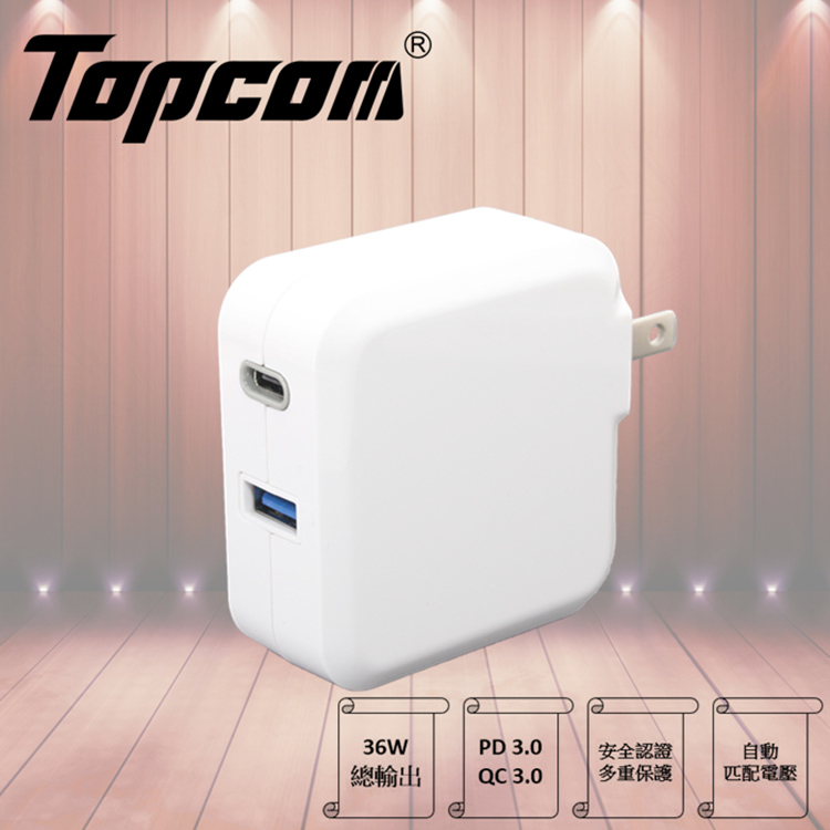 TC-KPD36WD 36W Type C PD3.0/USB QC3.0 可折疊插頭電源急快速充電器 - TOPCOM