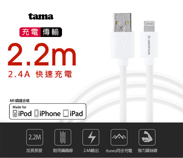 TIH42LTO22K 日本原裝Lightning 蘋果MFi認證2.2米充電傳輸線-黑色 - TAMA'S 多摩電子