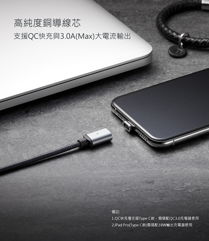 高純度銅導線,2.0A(Max)大電流輸出,磁吸充電快、狠、準