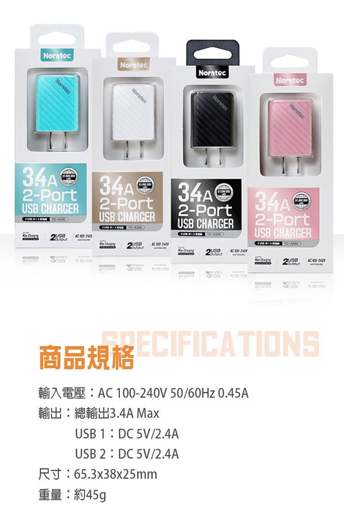 TC-A340P 色彩繽紛3.4A 雙USB輸出變壓器 - 粉色 - Noratec