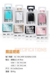 TC-A340P 色彩繽紛3.4A 雙USB輸出變壓器 - 粉色